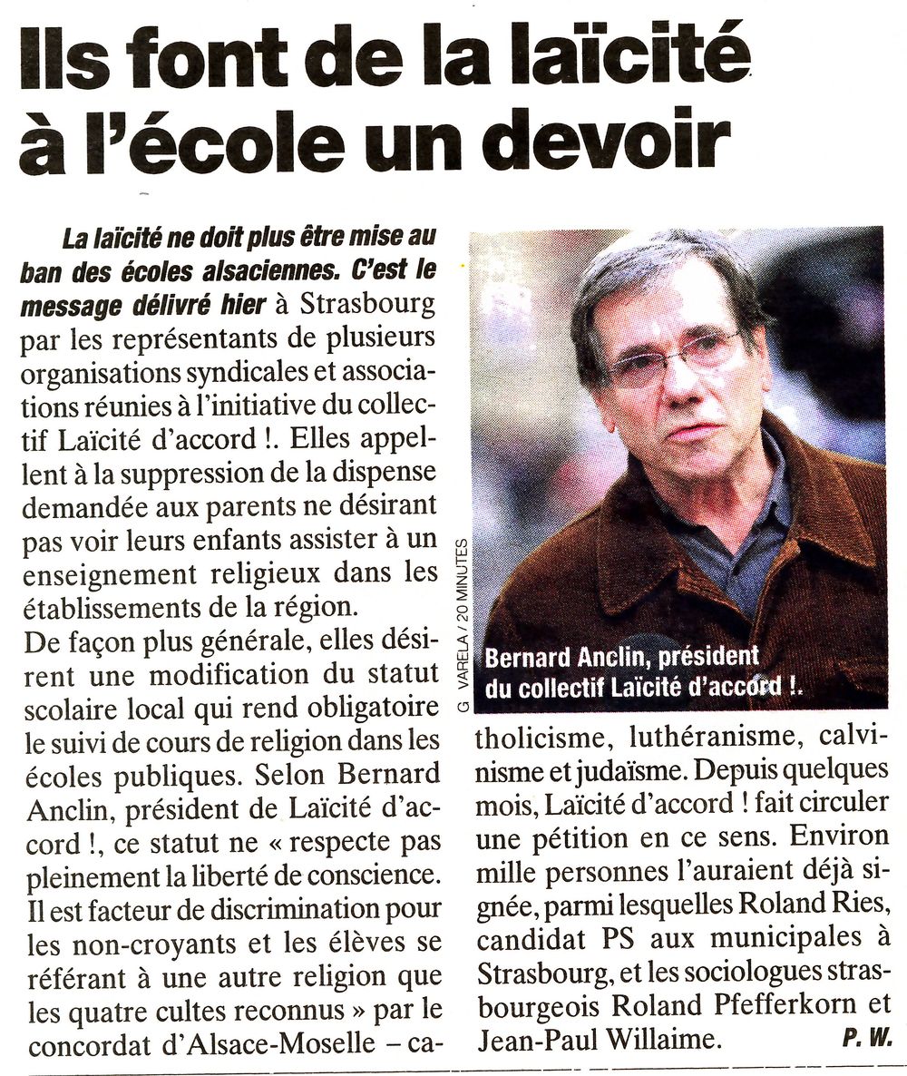 L.R.(*) Derniers chiffres connus en Alsace : en 2005, 27% des effectifs (35 200 élèves) inscrits en cours de religion dans l'enseignement secondaire, 55 800 dans le primaire (20 200 dispenses) selon les résultats transmis par 74% des écoles. En Moselle, moins de 50% d'élèves inscrits.Contacts : Laicité d'accord, 1A, place des Orphelins, 67000 Strasbourg,mail : laicite.d'accord@laposte.net